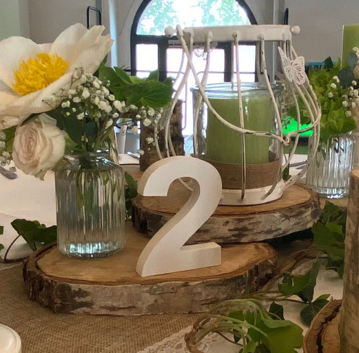 Tischnummer aus kleinen Birkenscheiben mit weißer Aufschrift. Rundet eure Dekoration in Holzoptik perfekt ab.